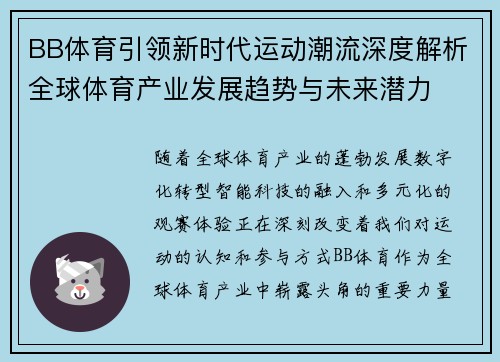 随着全球体育产业的蓬勃发展,数字化转型、智能科技的融入,和多元化的观赛体验,正在深刻改变着我们对运动的认知和参与方式。BB体育作为全球体育产业中崭露头角的重要力量,正引领着新时代运动潮流的发展。本篇文章将深入探讨BB体育如何在全球体育产业中引领潮流,并结合当前的全球体育产业发展趋势与未来潜力进行深度解析。首先,文章将从BB体育的品牌特色及其在数字化时代中的创新应用出发,分析其如何推动体育产业的发展;其次,探讨BB体育如何通过跨界合作提升运动品牌的全球影响力;接着,分析BB体育在未来体育赛事、数字化观赛及虚拟体育的潜力发展;最后,结合运动产业的未来趋势,对BB体育及整个行业未来的发展做出展望。